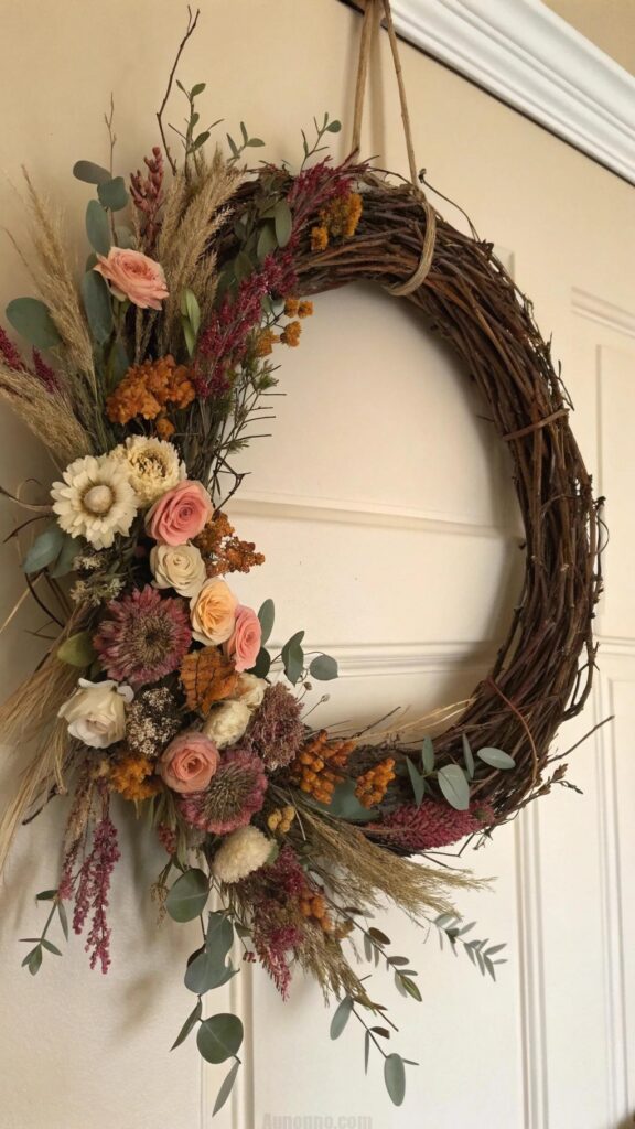 To make this wreath, start with a grapevine base. Attach the wildflowers using floral wire, ensuring they are evenly distributed. You can also add small accents like twigs or berries for added texture. This wreath is perfect for spring and summer, but you can easily transition it into fall by incorporating deeper hues.