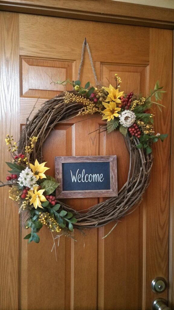 A rustic chalkboard wreath is a fun and interactive way to add a personal touch to your decor. This wreath can feature a chalkboard sign that allows you to write seasonal messages or quotes. It’s perfect for those who enjoy changing their decor frequently.