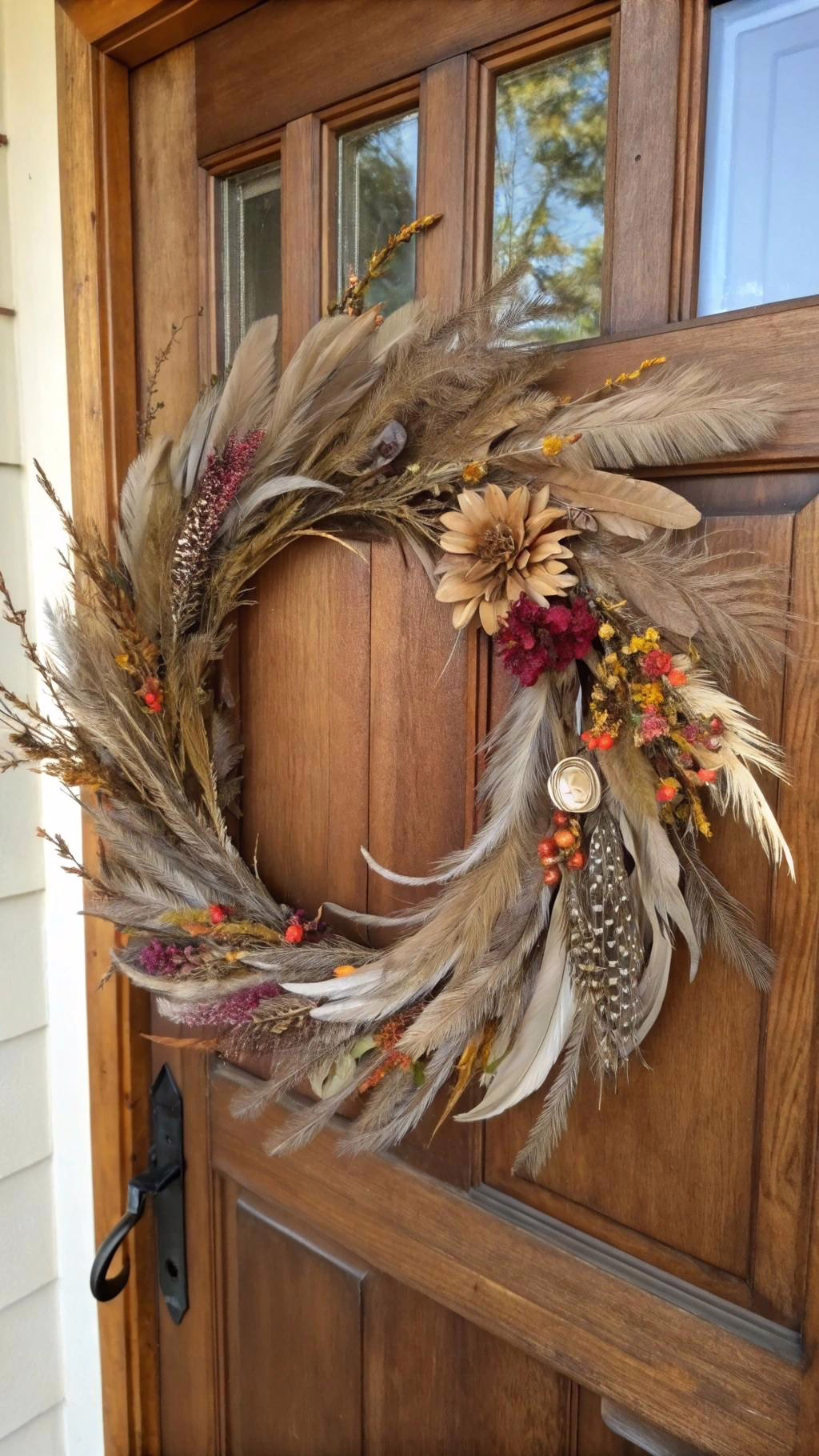 A rustic feather wreath adds a unique texture and a touch of bohemian flair to your farmhouse decor. Using natural feathers in earthy tones, you can create a stunning wreath that stands out. This wreath is perfect for those who appreciate a mix of rustic and eclectic styles.