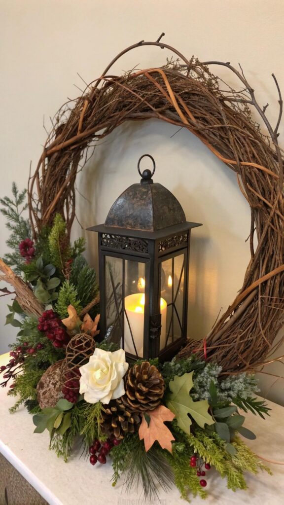 A rustic lantern wreath combines the charm of a wreath with the warmth of candlelight. This wreath can feature a lantern in the center, surrounded by seasonal decorations. It’s perfect for those who love to create a cozy atmosphere in their home.