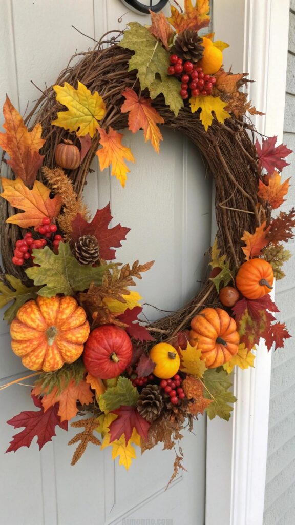 Celebrate the beauty of autumn with a fall harvest wreath. This wreath can be filled with elements like mini pumpkins, gourds, and colorful leaves, capturing the essence of the harvest season. The warm colors of orange, red, and yellow will bring a cozy feel to your home.