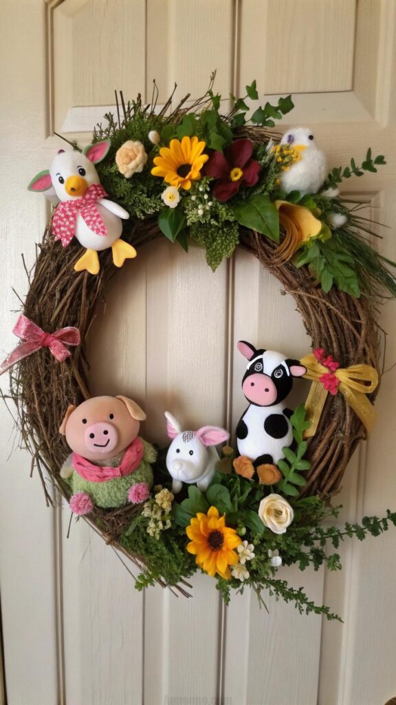 Celebrate the charm of farm life with a rustic farm animal wreath. This wreath can feature cute animal figurines, such as chickens, cows, or pigs, surrounded by seasonal decorations. It’s perfect for those who love the countryside and want to bring a playful touch to their decor.