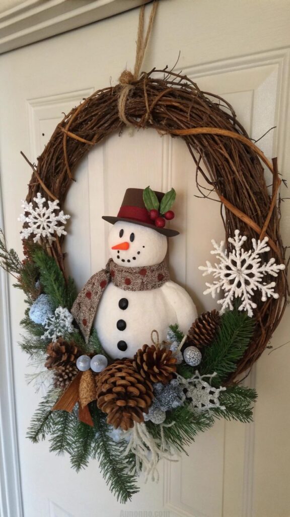Celebrate the winter season with a rustic snowman wreath. This wreath can feature a cute snowman figurine, surrounded by winter-themed decorations. It’s perfect for those who love to embrace the charm of winter and want to add a festive touch to their decor.