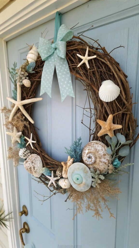 For a beachy vibe, consider a coastal farmhouse wreath. This wreath can incorporate elements like seashells, driftwood, and nautical colors, bringing a touch of the ocean to your home. It’s perfect for those who love coastal decor and want to blend it with rustic farmhouse style.