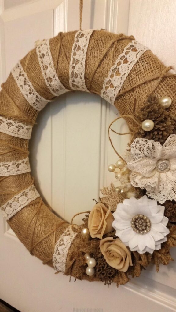 To create this wreath, start with a wire frame and wrap it in burlap. Then, add lace accents and embellishments like flowers or ribbons. This wreath is perfect for weddings or special occasions, but it can also be used as a charming everyday decor piece.