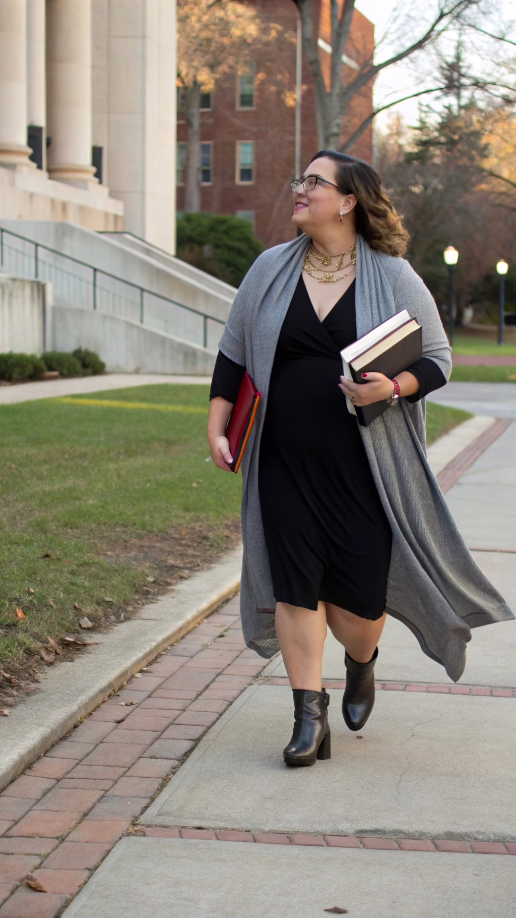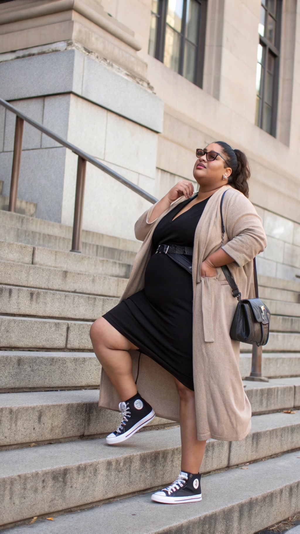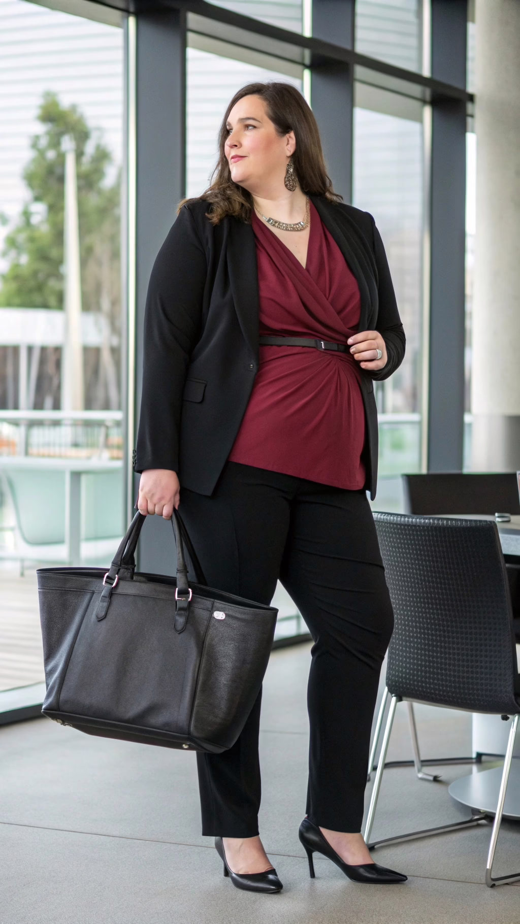 A structured blazer instantly elevates any big belly outfits plus size look. The tailored shape creates a polished silhouette while hiding problem areas. Wear it over a stretchy camisole or wrap top for balance.