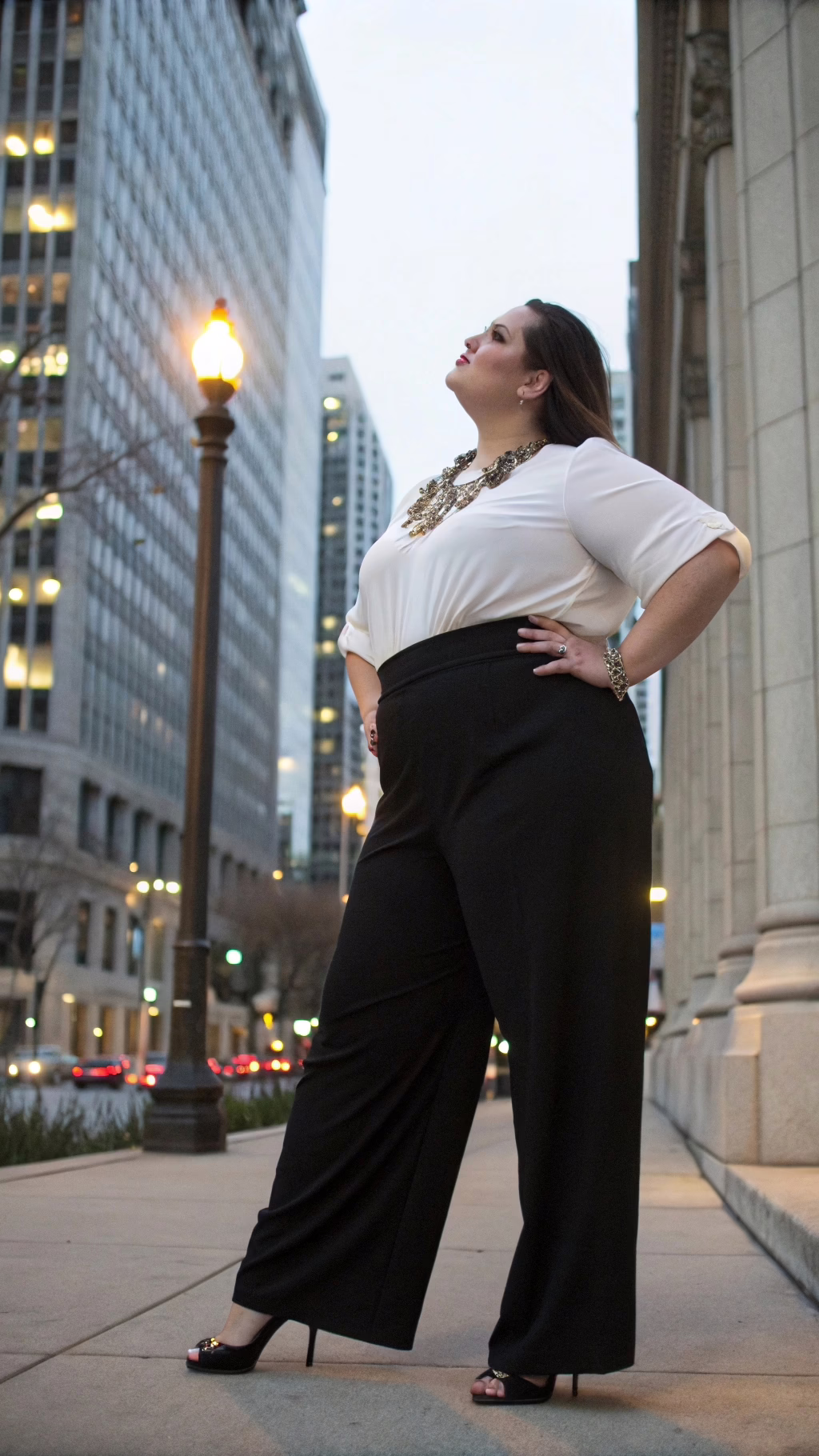 High-waisted palazzo pants smooth and support the belly area. The wide legs create a balanced, flattering shape. They work well with fitted tops for a polished look.