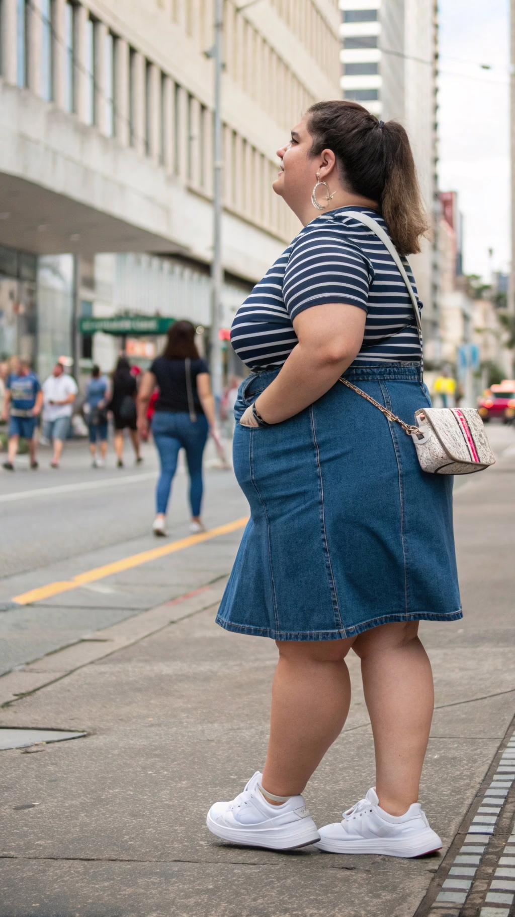 High-waisted jeans with built-in tummy panels are a game-changer for big belly outfits plus size. The smoothing fabric provides gentle compression without discomfort. The high rise helps create an hourglass silhouette by lifting and shaping.