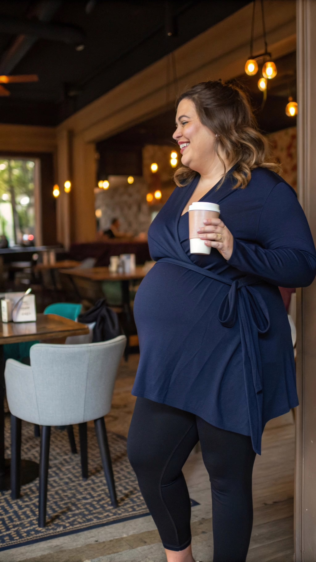 Wrap tops define the waist without squeezing the belly. The adjustable fit makes them ideal for big belly outfits plus size. They pair well with skirts, jeans, or leggings.