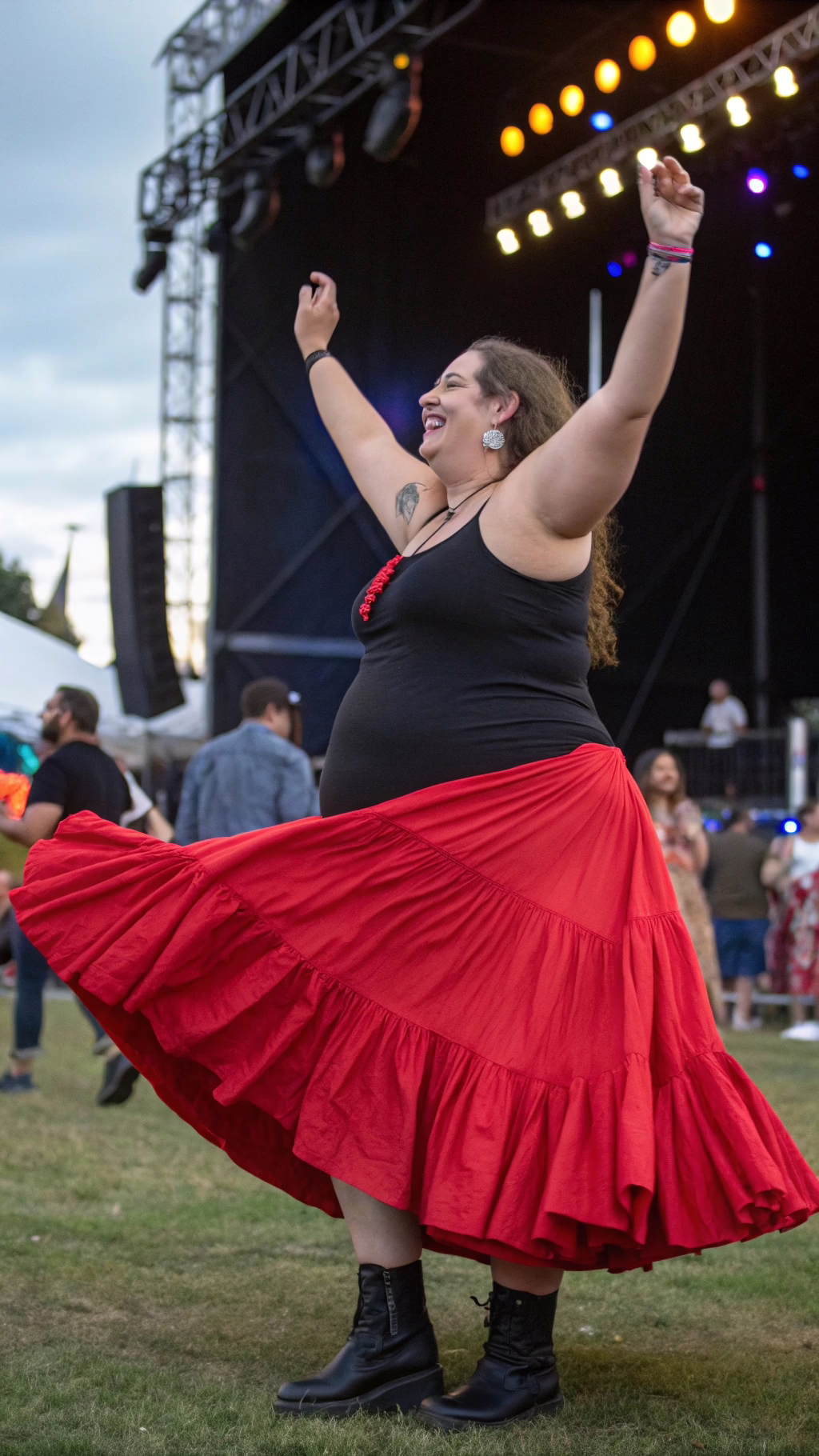 Tiered ruffle skirts create beautiful movement in big belly outfits plus size. The cascading layers distract from the midsection while adding playful volume. High waisted versions provide gentle tummy control.