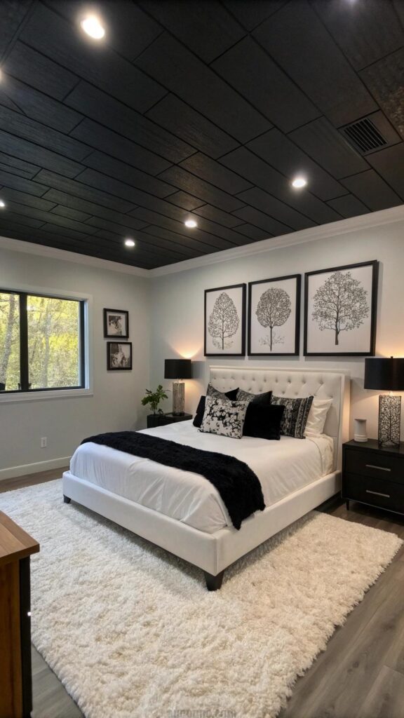 This design suits contemporary or bold bedrooms. A white rug softens the floor. Monochrome art enhances the cohesive look. The ceiling adds unexpected drama.