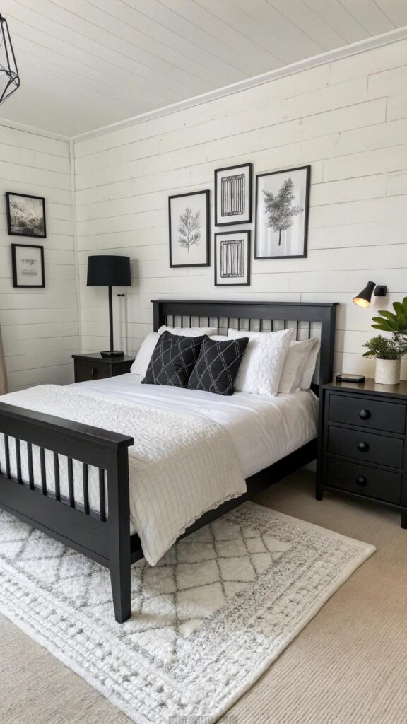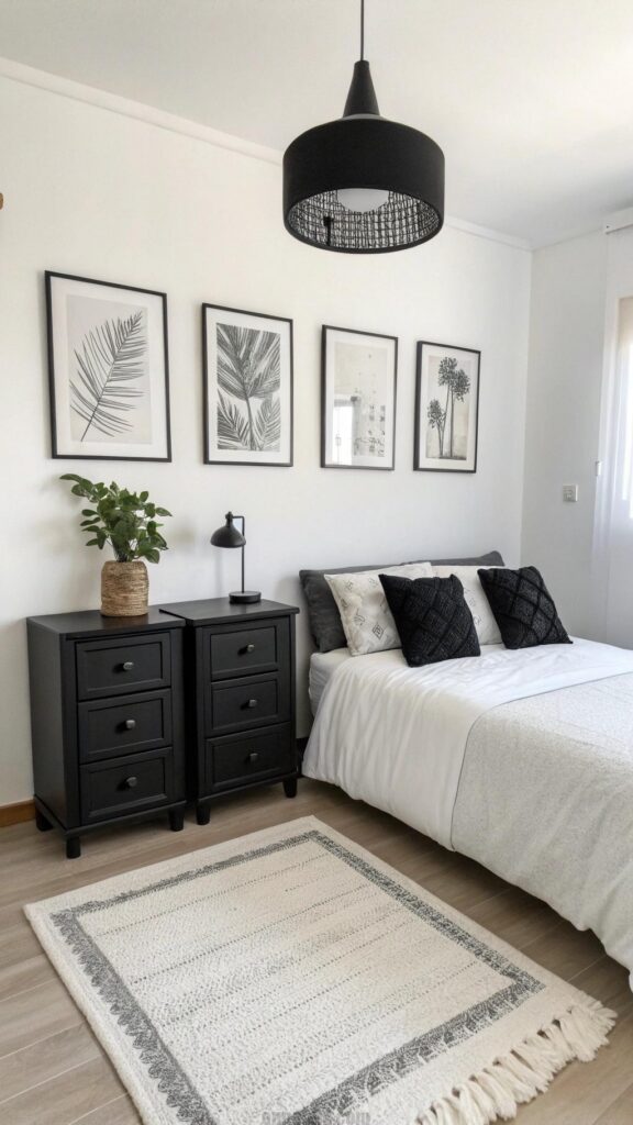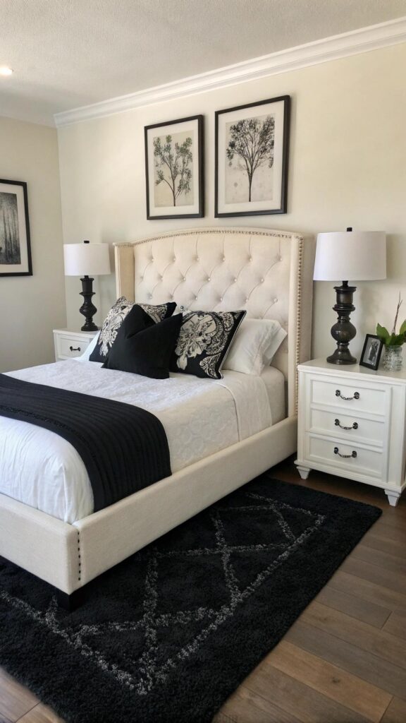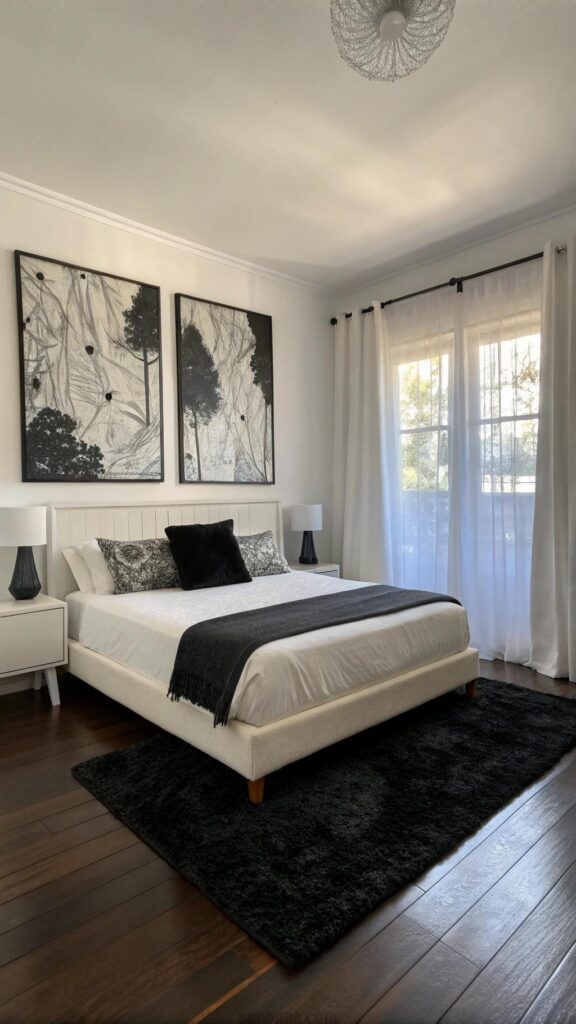 White bedding keeps the room airy. This design fits small or large bedrooms. A black rug adds texture underfoot. Monochrome art enhances the cohesive look. The style balances light and dark elements.