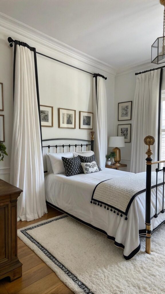 White curtains with black trim add elegance. The trim creates a subtle contrast. The curtains soften the room’s look. A black bedframe anchors the design. White bedding keeps the space airy.
