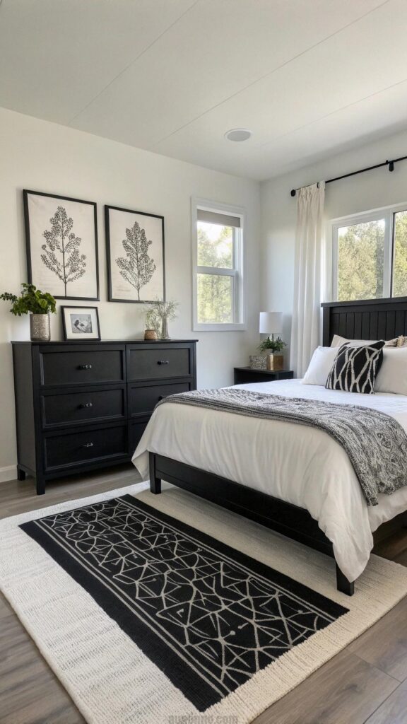 This design suits modern or eclectic bedrooms. White walls brighten the space. Monochrome art enhances the cohesive look. The rug elevates the room’s style.
