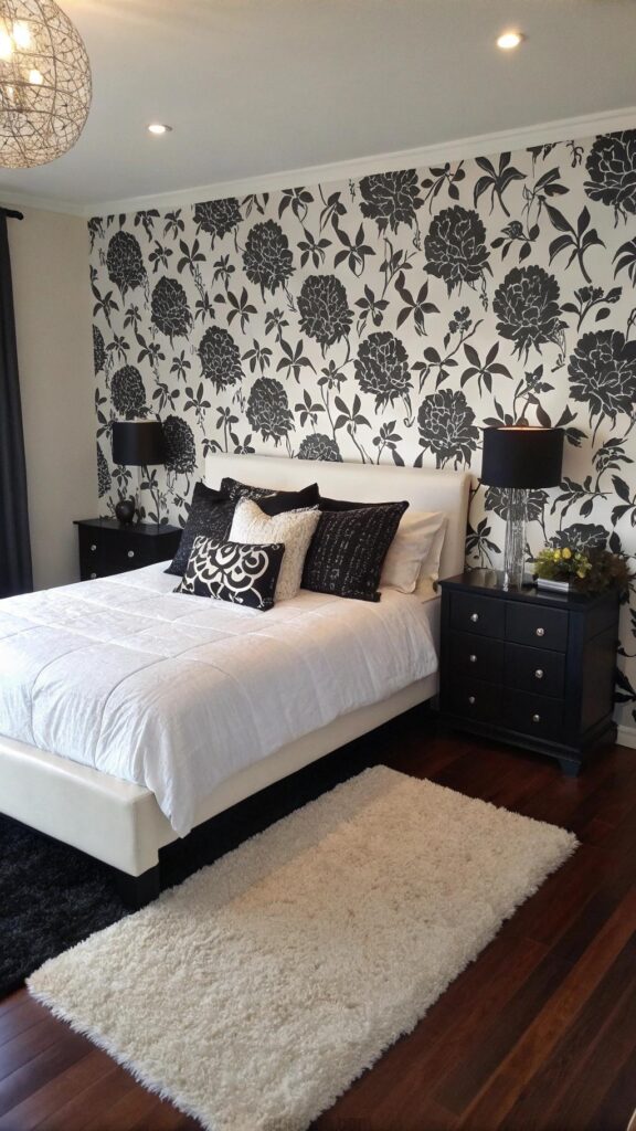 A stenciled wall adds artistic flair. Black and white patterns create a unique backdrop. The design feels bold yet balanced. A white bed complements the wall’s contrast. Black pillows add cozy texture.