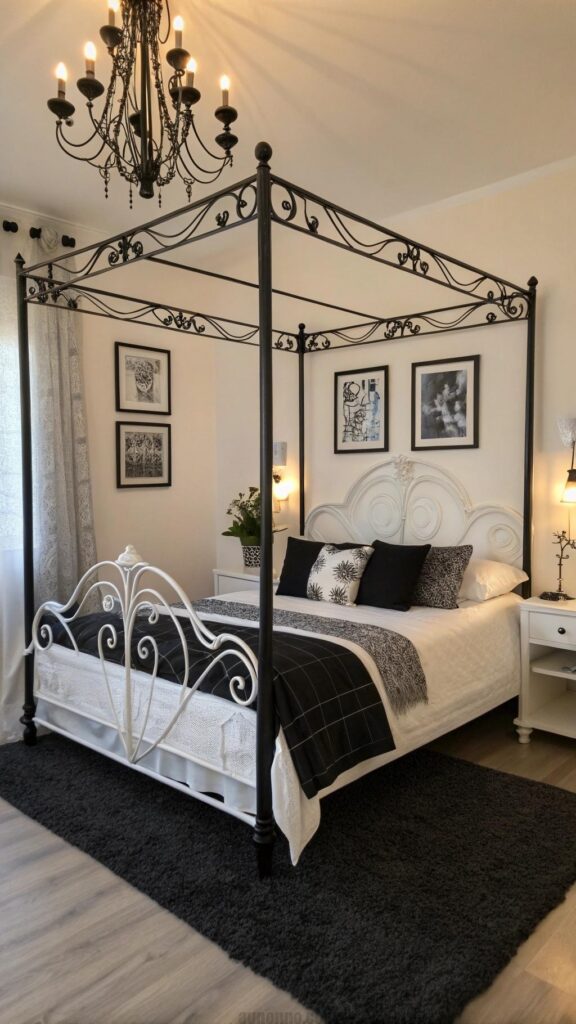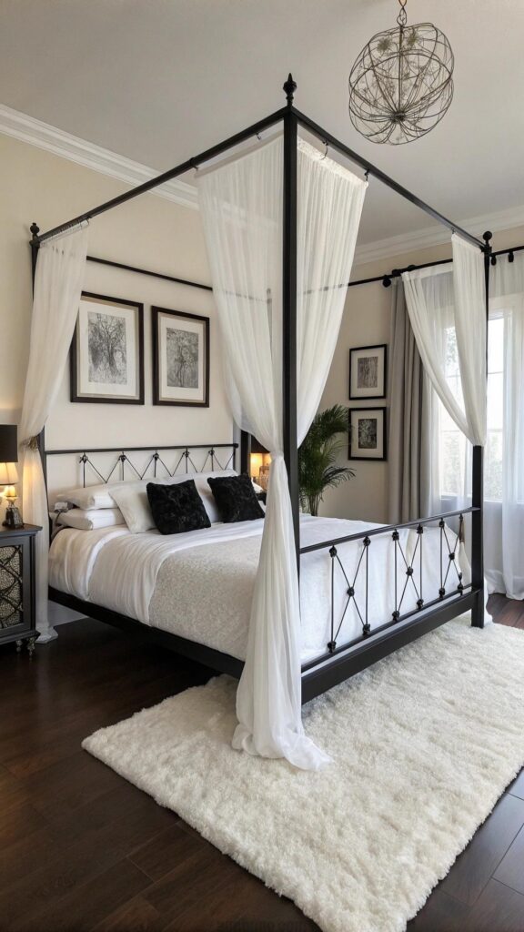 A black canopy bed adds elegance. White curtains create a soft, airy contrast. The bed becomes the room’s focal point. White bedding enhances the serene vibe. Black pillows add subtle texture.