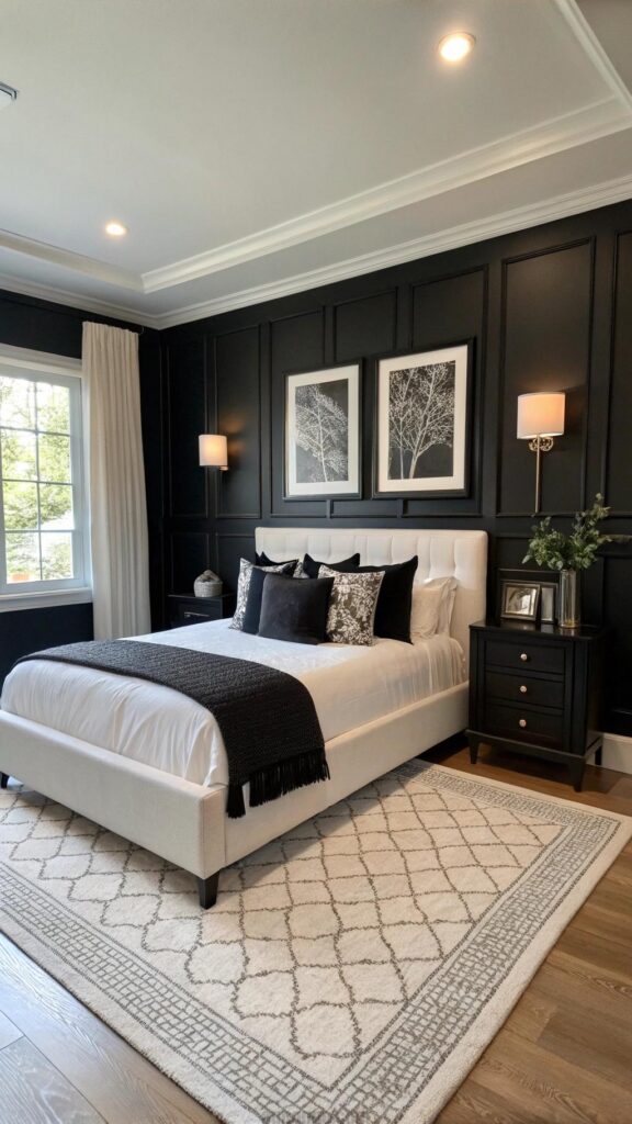 A black wall with white trim adds drama. The trim creates a clean, defined edge. The contrast feels bold and sophisticated. A white bed balances the dark wall. Black pillows add cozy texture.