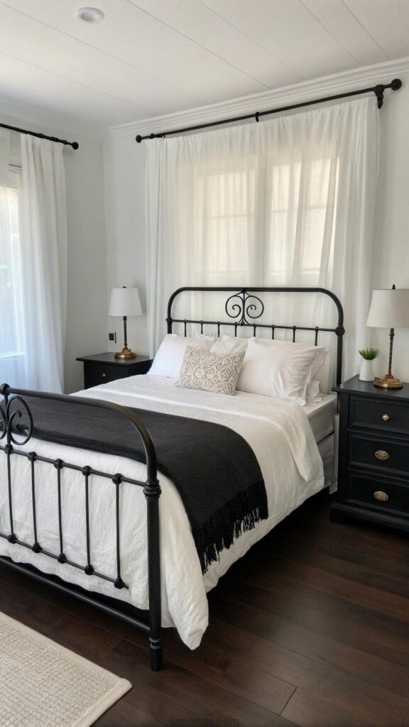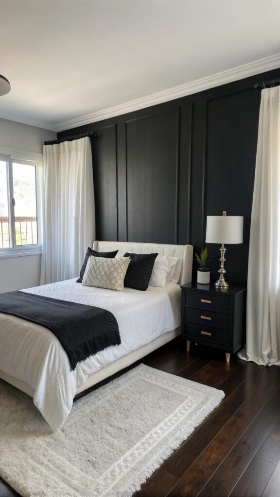 White curtains soften the bold look. This setup suits minimalist or modern bedrooms. A black throw adds warmth to bedding. Wall art in monochrome tones ties it together. The design emphasizes simplicity and elegance.