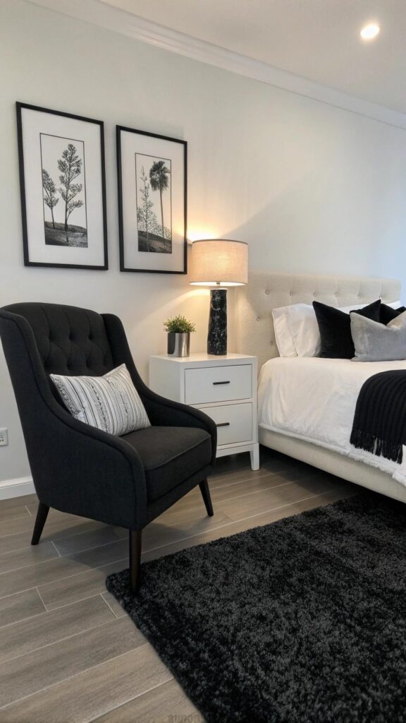 This design suits modern or eclectic bedrooms. A black rug grounds the space. Wall art enhances the monochrome theme. The chair adds functional charm.