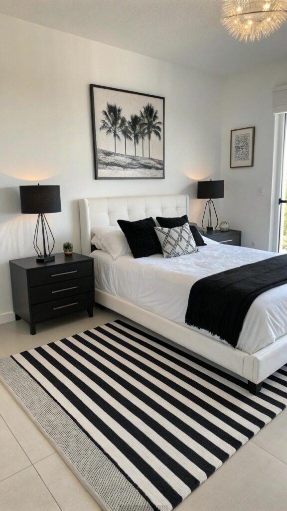 A striped rug adds bold texture. Black and white stripes ground the room’s design. The rug ties the space together. A white bed keeps the look clean. Black pillows add cozy contrast.