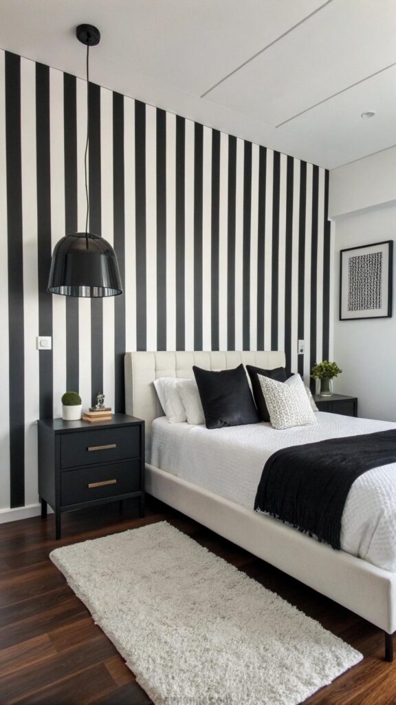 A striped accent wall adds drama to the bedroom. Black and white stripes create a bold focal point. The pattern energizes the room’s aesthetic. A white bed complements the wall’s contrast. Black throw pillows add cozy texture.