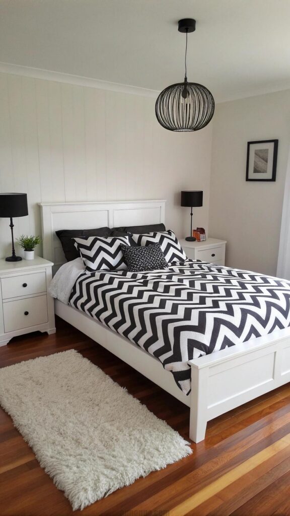 Chevron bedding adds energy to the bedroom. Black and white patterns create a dynamic look. The bedding serves as the room’s centerpiece. White walls keep the space bright. Black furniture complements the chevron pattern.