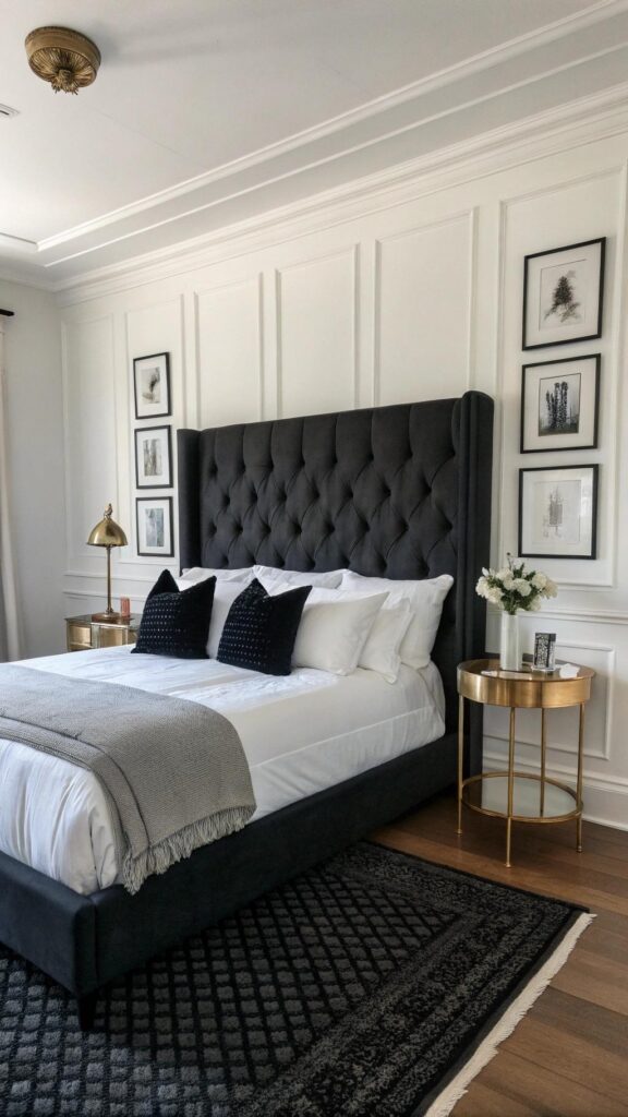 A black headboard creates a strong focal point. White walls keep the room bright and open. The contrast feels elegant and timeless. White bedding complements the headboard’s boldness.