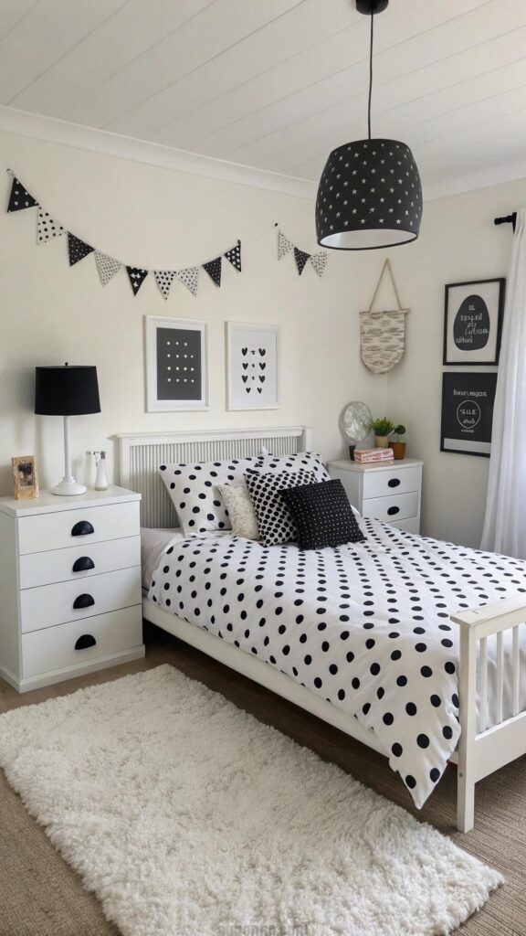 Polka dot bedding adds playful charm. Black and white dots create a fun vibe. The bedding becomes the room’s centerpiece. White walls keep the space bright. Black furniture complements the pattern.