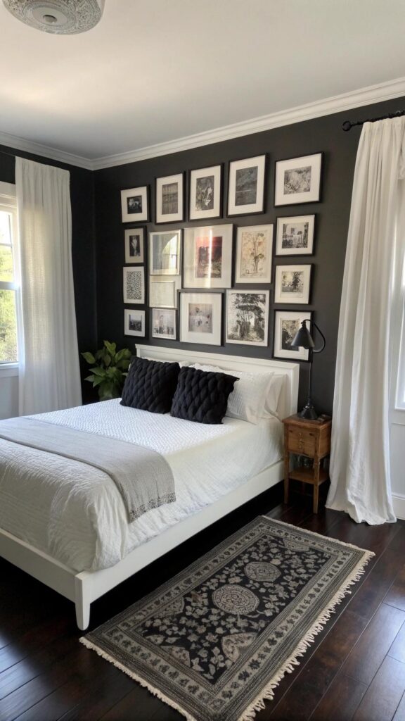 A gallery wall adds personality to the bedroom. Black and white frames create a cohesive look. The art becomes the room’s focal point. A white bed keeps the space clean. Black pillows add a cozy touch.