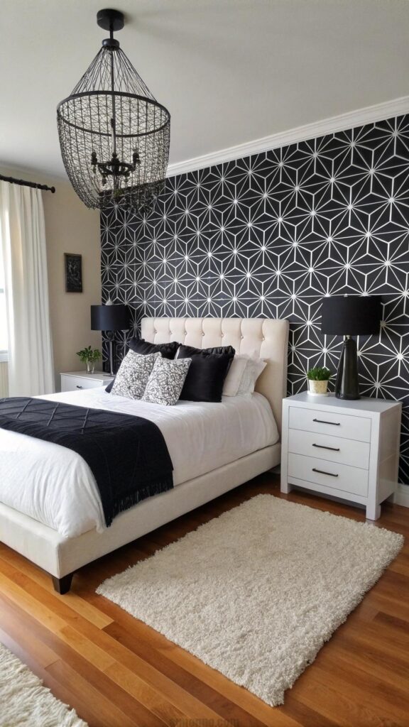 Patterned wallpaper adds personality to the bedroom. Black and white geometric designs create visual interest. The wallpaper serves as a bold backdrop. White bedding balances the busy pattern.