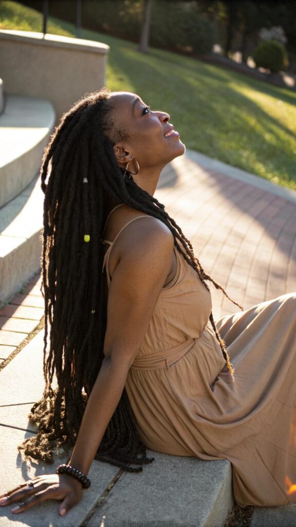 Classic long dreadlocks represent the timeless foundation of black women dreadlocks hairstyles that never go out of style. These rope-like strands hang freely and create a powerful statement of natural beauty and cultural pride. The length allows for maximum versatility in styling and showcases the full beauty of mature locs.