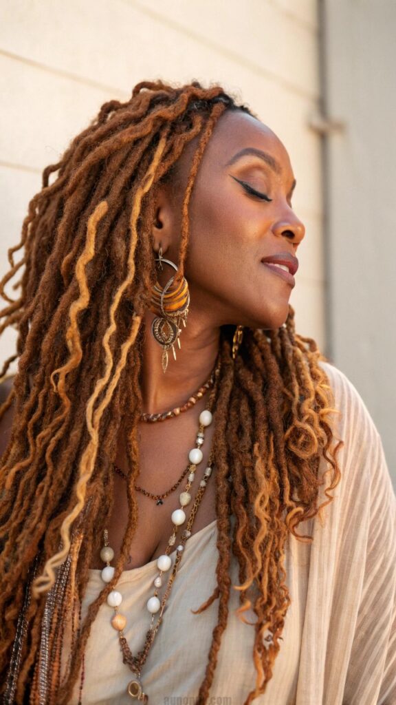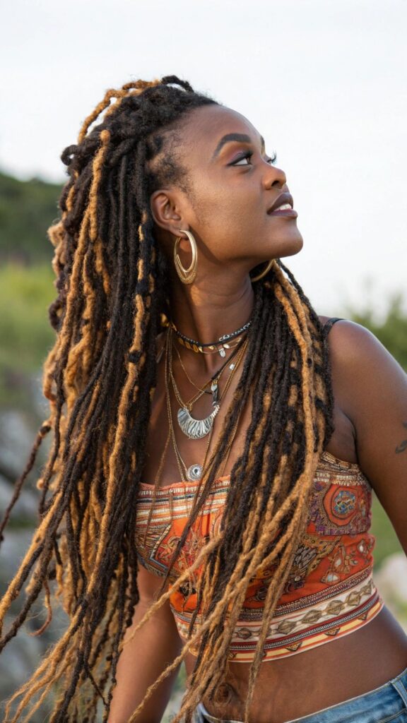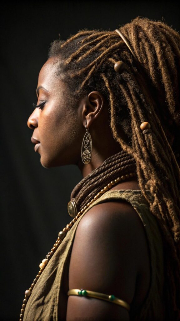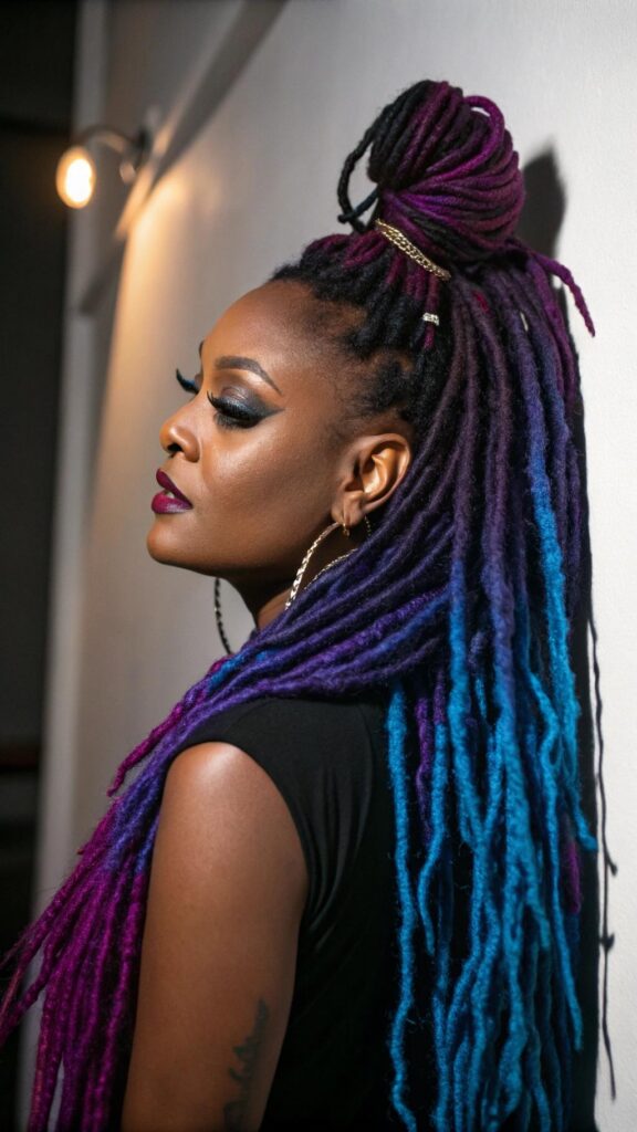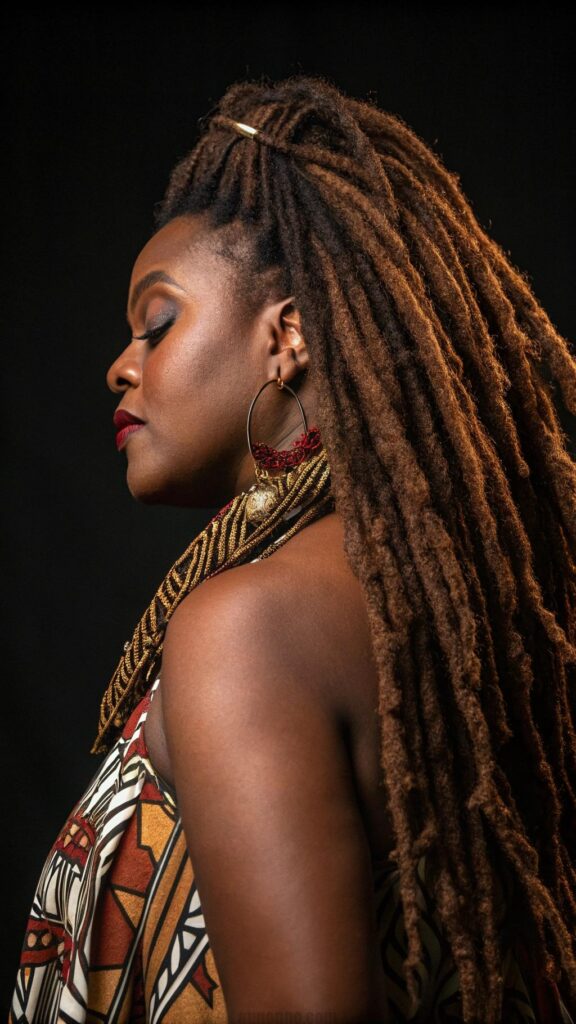 Colored dreadlocks allow for creative expression within black women dreadlocks hairstyles by incorporating vibrant hues or subtle highlights. From bold reds and blues to natural-looking caramel and honey tones, color can transform traditional locs into artistic statements. The porous nature of locked hair holds color well, making it ideal for experimenting with different shades.