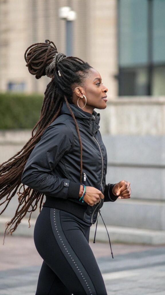 High buns create dramatic height and showcase the neck and shoulders, while low buns offer classic elegance suitable for any occasion. The bun can be tight and controlled for professional settings or loose and textured for casual wear. Hair donuts and bobby pins help secure longer locs in place.