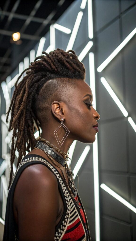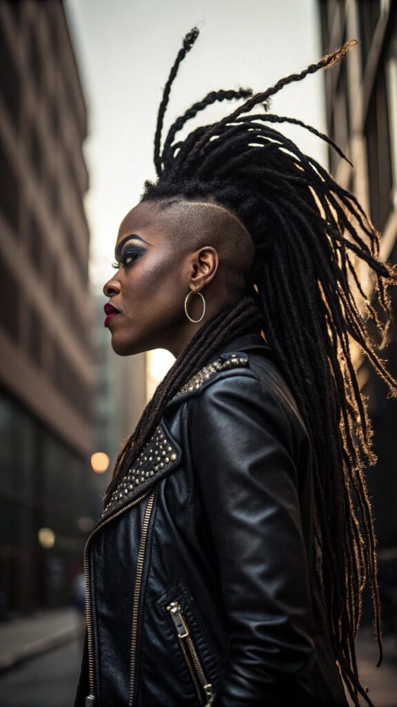 Mohawk dreadlocks create bold, edgy statements within black women dreadlocks hairstyles that command attention. This dramatic style involves creating height through the center of the head while keeping the sides sleek or shaved. The contrast between the elevated center section and the controlled sides creates striking visual impact.
