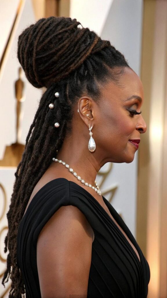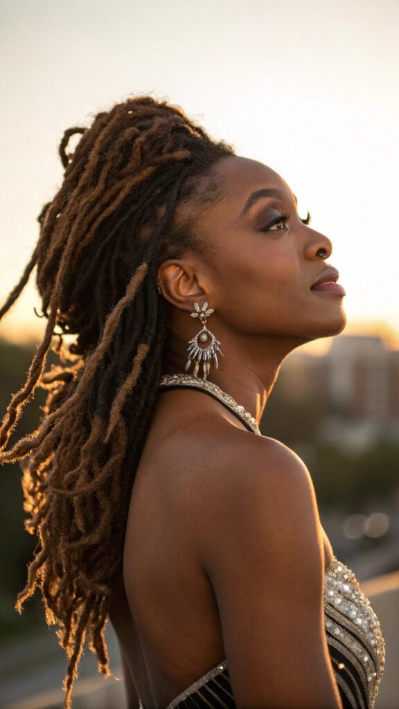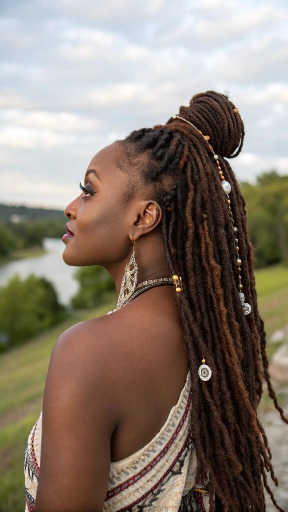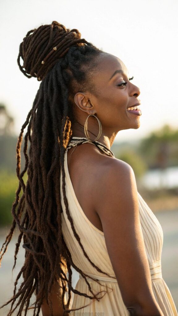 Accessories can enhance half-up half-down styles through decorative hair ties, clips, or wraps that complement the overall aesthetic. The style works particularly well for women with longer locs who want to show length while keeping hair functional. It’s perfect for both everyday wear and special occasions.