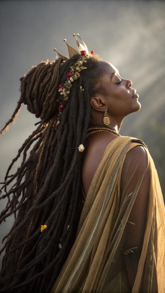 Loc crown braids create ethereal, goddess-like appearances by incorporating dreadlocks into circular braided patterns around the head. This regal styling approach within black women dreadlocks hairstyles combines protective benefits with stunning visual impact. The crown effect frames the face beautifully while showcasing the length and texture of the locs.