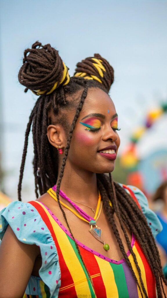 Space buns with locs create playful, youthful looks that combine fun with functionality in black women dreadlocks hairstyles. This style involves creating two buns positioned high on either side of the head, offering a cute alternative to traditional single buns. The positioning creates a balanced, symmetrical look that works well for casual occasions and creative expression.