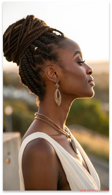 A braided loc crown wraps locs around the head like a halo. The look feels regal and keeps hair secure.
