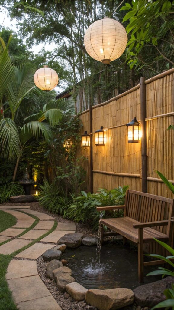 You can use bamboo poles to create a simple, vertical fence or weave reeds for a more intricate look. Add some fairy lights or paper lanterns to enhance the ambiance. This type of fence pairs well with tropical plants like palms and bird-of-paradise.