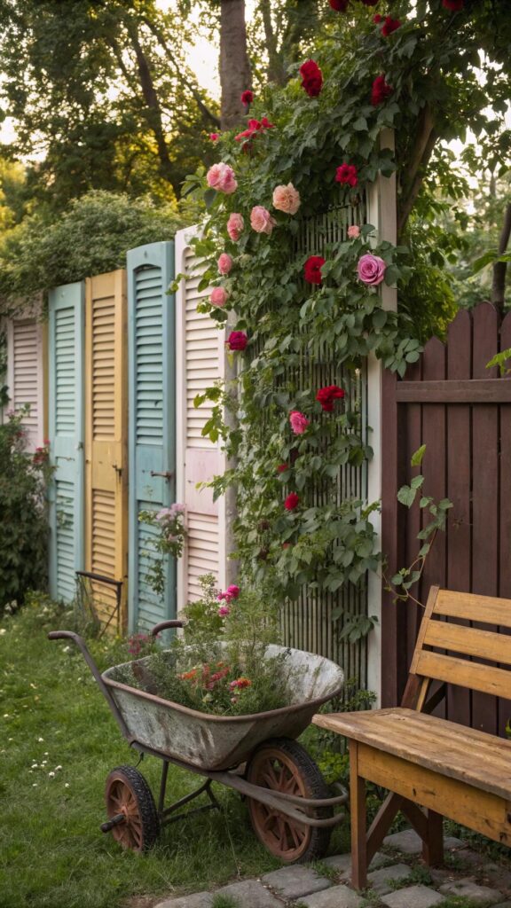 You can also use the shutters as a trellis for climbing plants. The combination of weathered wood and lush greenery creates a timeless, bohemian feel. Add some vintage garden decor, like an old wheelbarrow or metal watering cans, to complete the look.