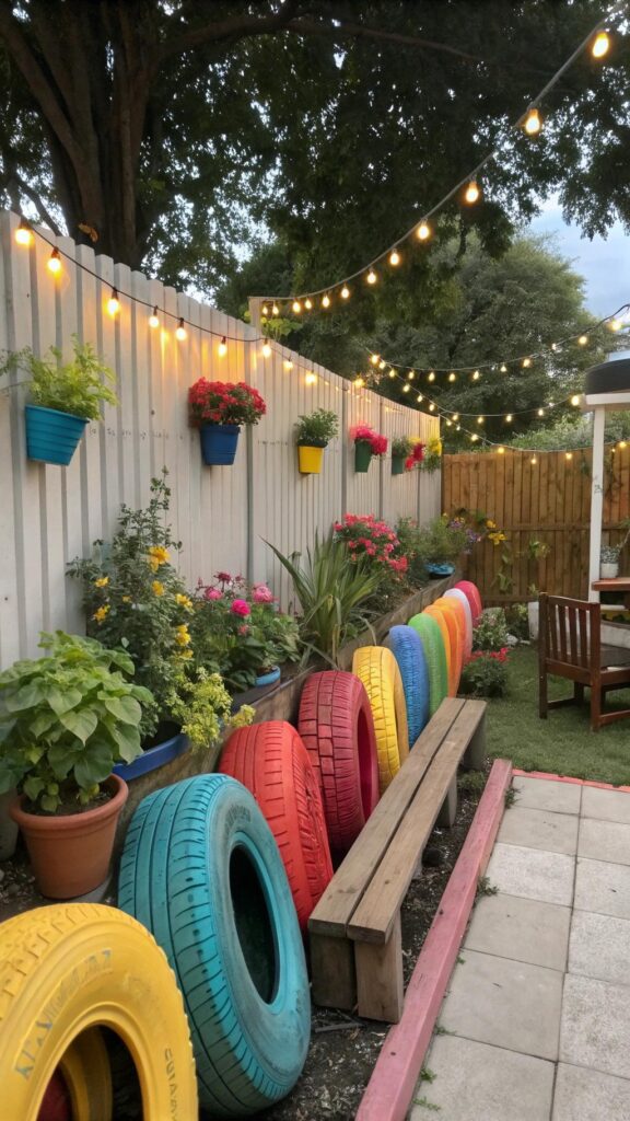 An upcycled tire fence is both eco-friendly and visually striking. Use old tires painted in bright colors to create a unique, artistic fence. The tires can be stacked or arranged in patterns for different effects.