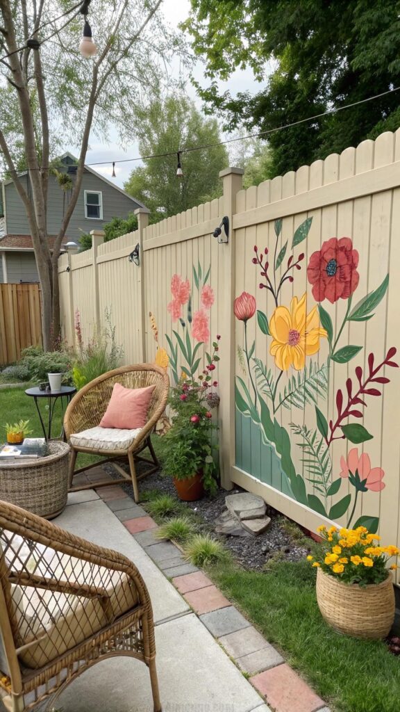 A painted floral fence is a vibrant and artistic way to add boho charm to your garden. Use bright colors and floral patterns to create a visually stunning design. This type of fence works well as a focal point in your garden.