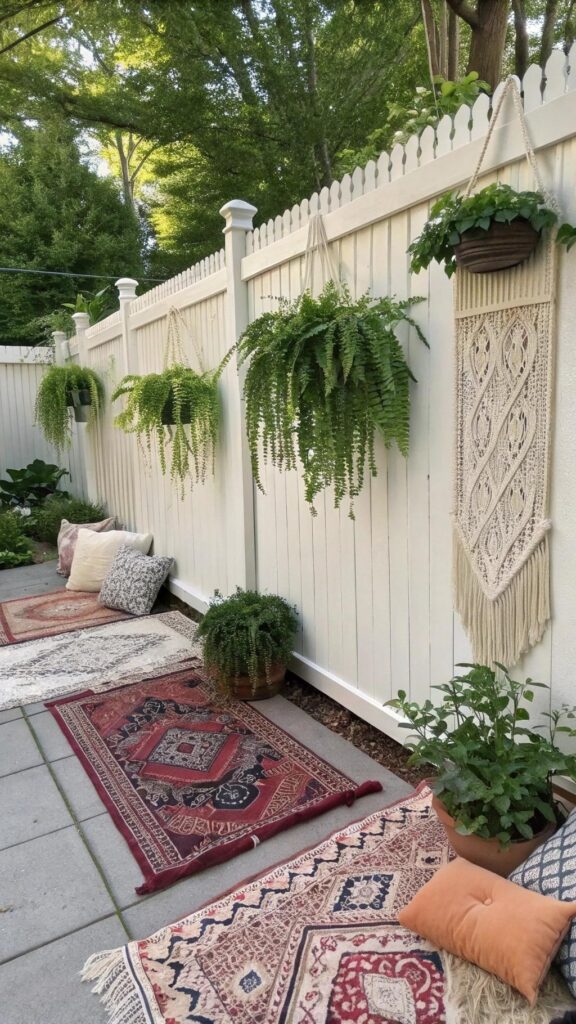 Macramé is a staple in boho design, and it works beautifully as a fence accent. Use macramé panels to add texture and visual interest to a simple wooden or metal fence. The intricate knots and patterns create a handmade, artisanal feel.