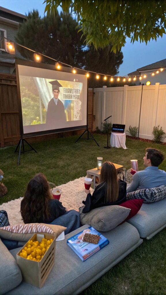 Provide popcorn, candy, and drinks for a true cinema experience. Add string lights and lanterns to create a cozy ambiance. This idea is perfect for a laid-back celebration with friends and family.