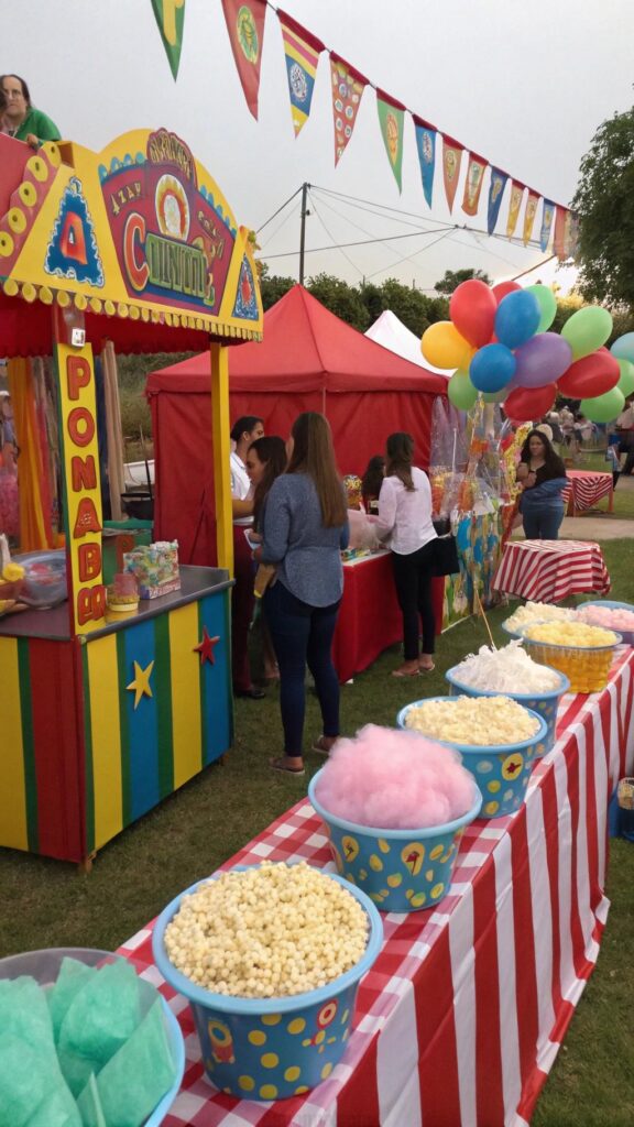 Serve carnival favorites like cotton candy, popcorn, and funnel cakes. Add a photo booth with fun props and backdrops. This theme is perfect for a lively and entertaining celebration.