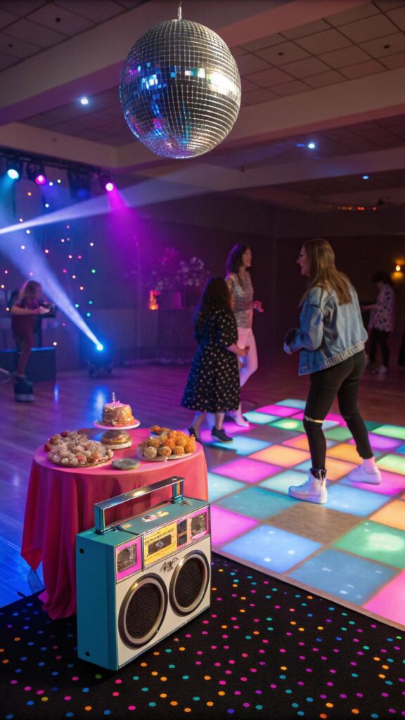 Serve retro snacks like slushies, pretzels, and candy. Add a custom cake shaped like a boombox or a vinyl record. This theme is perfect for a high-energy and fun celebration.