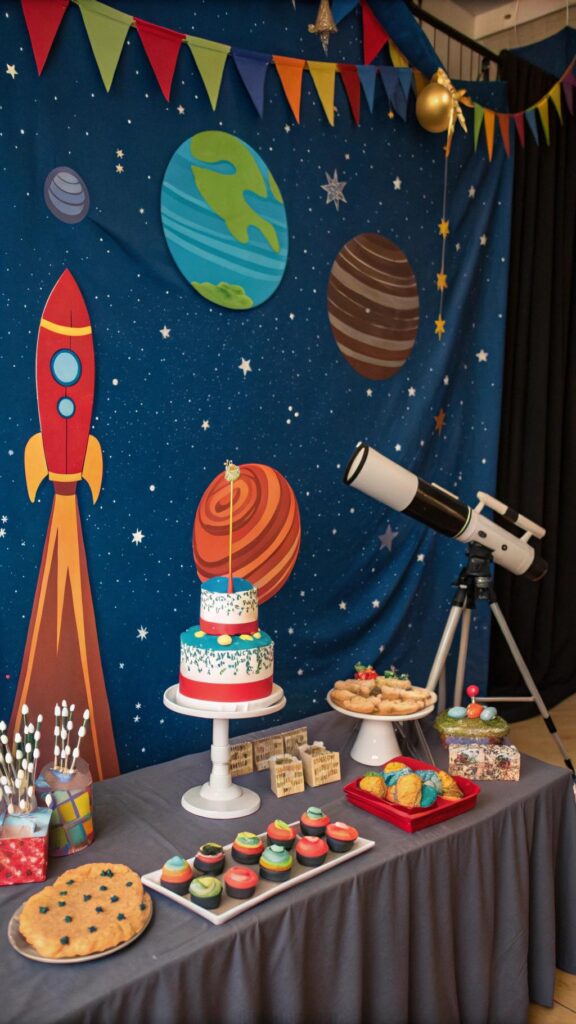 Celebrate with a space-themed party for a boy who loves astronomy. Use starry backdrops, planet decorations, and glow-in-the-dark elements. Set up a telescope for stargazing if possible.