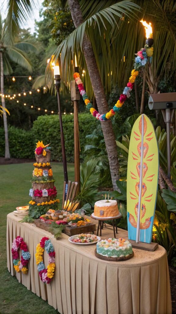 Serve Hawaiian foods like pulled pork, pineapple skewers, and coconut drinks. Add a custom cake shaped like a surfboard or a pineapple. This theme is perfect for a boy who loves summer vibes.