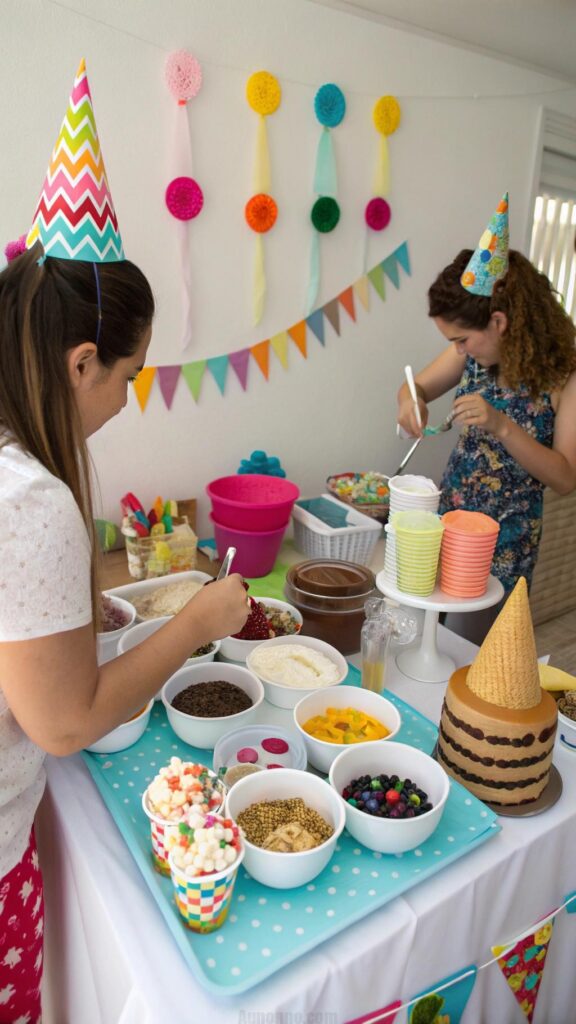 A DIY ice cream sundae party is a sweet and fun way to celebrate. Set up a station with various ice cream flavors, toppings, and sauces. Use colorful decorations and sprinkles as part of the theme.