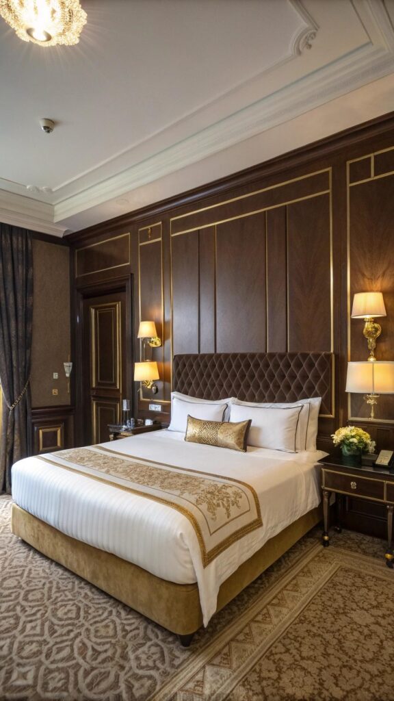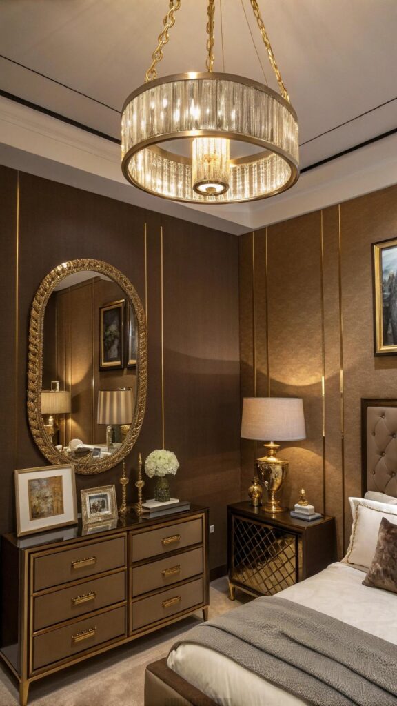 Gold and brass accents elevate brown bedroom designs. These metallic finishes add a touch of glamour. They create a sophisticated and opulent atmosphere.